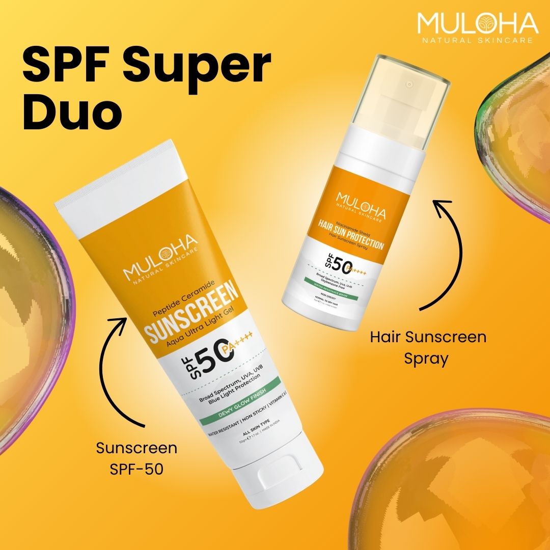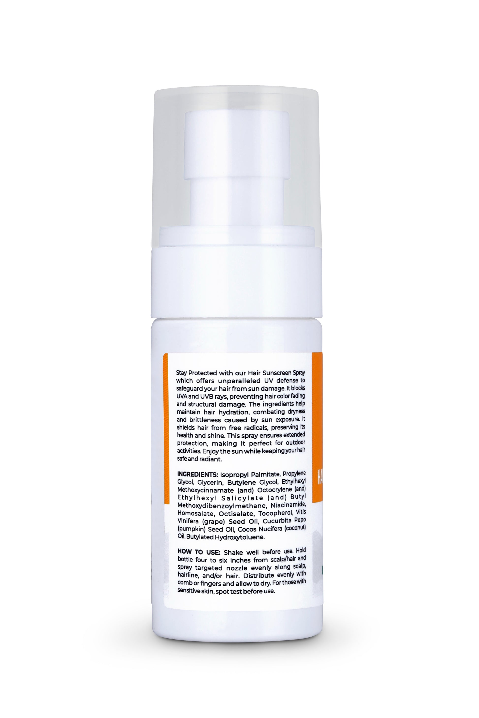 Stay Protected with our Hair Sunscreen Spray which offers unparalleled UV defence to safeguard your hair from sun damage. The lightweight and non-greasy formula blocks UVA and UVB rays, preventing hair colour fading and structural damage. The ingredients help maintain hair hydration, combating dryness and brittleness caused by sun exposure. It shields hair from free radicals, preserving its health and shine. This spray ensures extended protection making it perfect for outdoor activities Enjoy the sun while keeping your hair safe and radiant. Pumpkin seed oil strengthens the hair, Niacinamide and grapeseed protects the hair from UV rays. Coconut oil helps to combat the damaging effects of free radicals, maintaining the hair's colour and luster even in sunny environments.